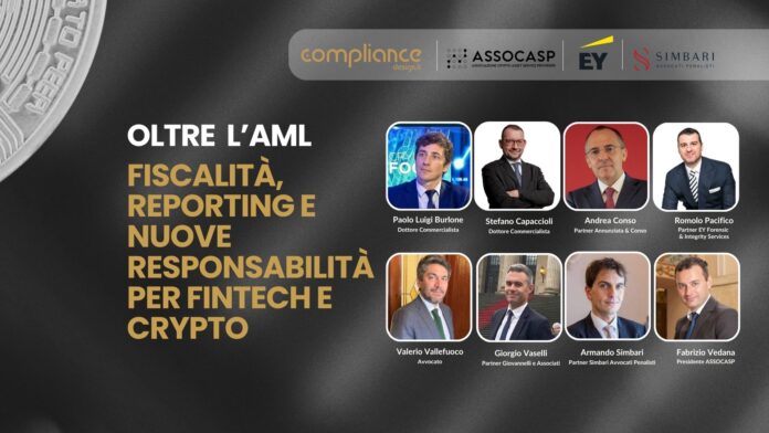 Il progressivo consolidamento del settore crypto sta spostando il focus ben oltre i tradizionali presidi antiriciclaggio, portando al centro del dibattito temi come fiscalità, trasparenza e responsabilità. In questo quadro si inserisce il talk “Oltre l’AML. Fiscalità, reporting e nuove responsabilità per fintech e crypto”, organizzato da ComplianceDesign.it in collaborazione con ASSOCASP, EY Forensic & Integrity Services e Simbari Avvocati Penalisti, che ha visto il confronto tra Paolo Luigi Burlone, Stefano Capaccioli, Andrea ConsoValerio Vallefuoco, Giorgio Vaselli e Armando Simbari, con la moderazione di Fabrizio Vedana.